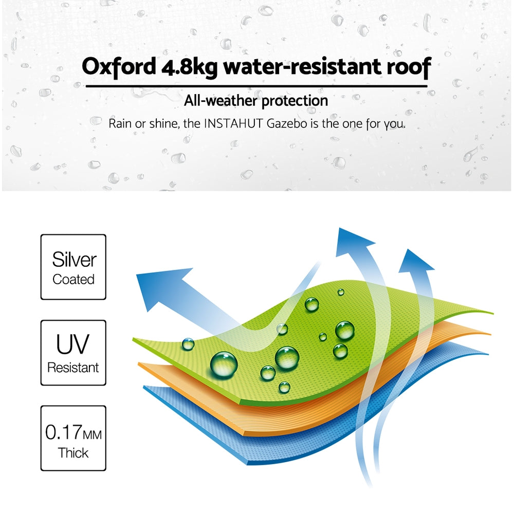 Featuring high density, long lasting Silver coated oxford fabric with effective UV and water repellent treatments, this INSTAHUT 3X4.5m Pop Up Gazebo provides a lovely ground and canopy coverage of 300 x 450cm. It is perfect for all your upcoming outdoor activities, as a sunshade station as well as a shelter for unexpected rains.