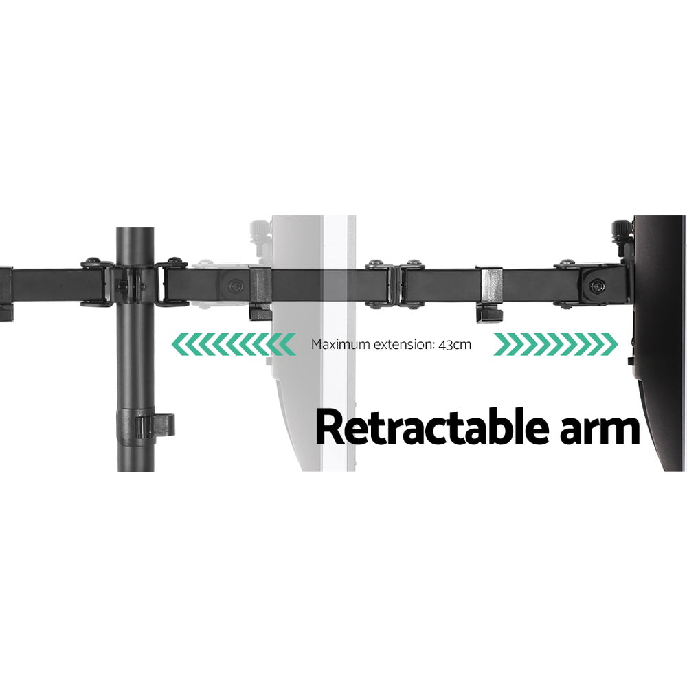 Add some extended mobility to your monitor with our Fully Adjustable Dual Monitor Arm. With it, you can extend both arms up to 43cm to set your preferred viewing position and retract it with ease. Height adjustments can be easily done by twisting the height adjustment screw. It also allows you to swivel your monitor 180°, rotate it 360° or tilt it up to 45° and set in either landscape or portrait format. Using the detachable VESA mount, you can mount any monitor size of up to 32""* with a maximum weight capacity of 8kg on each arm. Plus, you can also fine tune the monitors’ alignment with the VESA plate height adjustment. Other great features include alternative set ups, cable loops for neat and tidy cabling and a tools holder for allen keys. Not least, made from heavy-duty steel, the monitor arms are designed to stand up to longlasting use without missing a beat. All the necessary mounting hardware and an assembly manual are included in the package for a hassle-free set up.